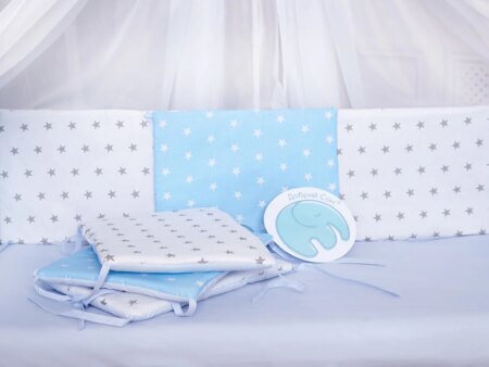 Четыре боковых бортика из шести пошиты “пэчворком” в комбинации бязи и нежного плюша “Minky” , что создает эфект мозаики, а два – просто из бязи и сделаны так, что можно их переставлять местами меняя сочетание расцветок. На каждом бортике имеются четыре беечки- завязочки размером 30см, позволяющие фиксировать защиту к быльцам кроватки, в наполнение бортиков используется синтепон 300-й плотности.